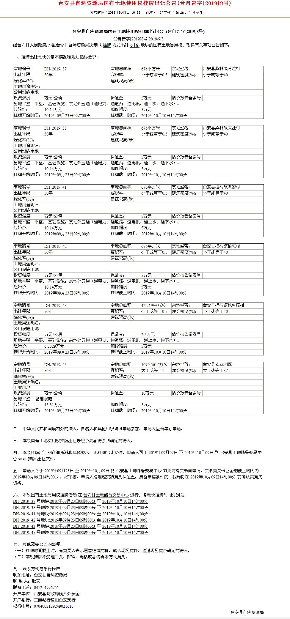 【出让公告】台自告字[2019]8号-出让公告-台安县人民政府
