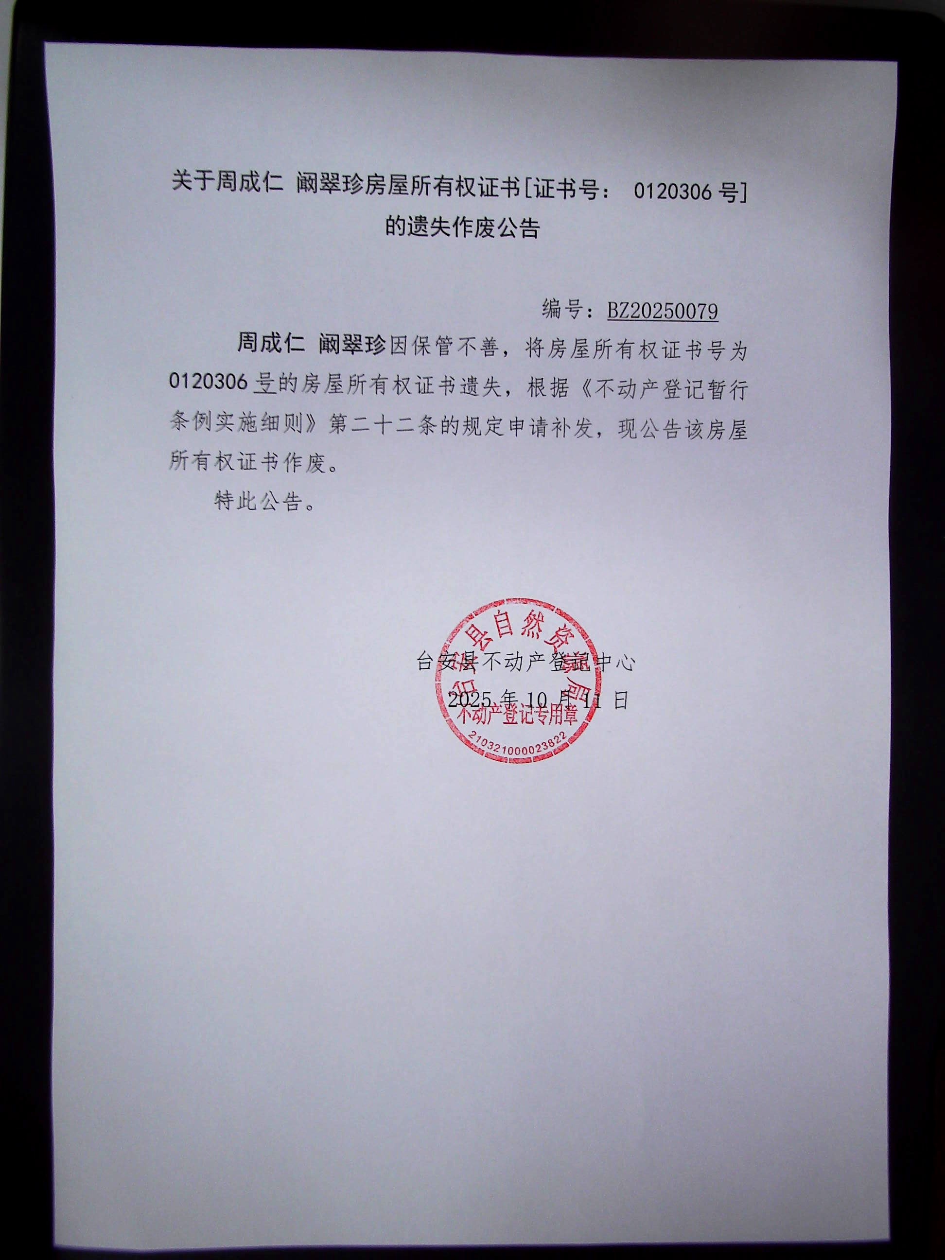 【遗失公告】关于 周成仁、阚翠珍 房屋所有权证书[证书号:0120306号]的遗失作废公告